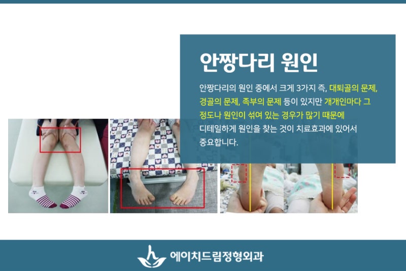 허벅지의 원인으로는 크게 세 가지, 즉 대퇴골 문제, 경골 문제, 족부 문제 등이 있는데 개개인마다 그 정도나 원인이 섞여 있는 경우가 많기 때문에 세밀하게 원인을 찾는 것이 치료 효과에 있어서 중요합니다.안다리를 유발하는 세 가지 요인