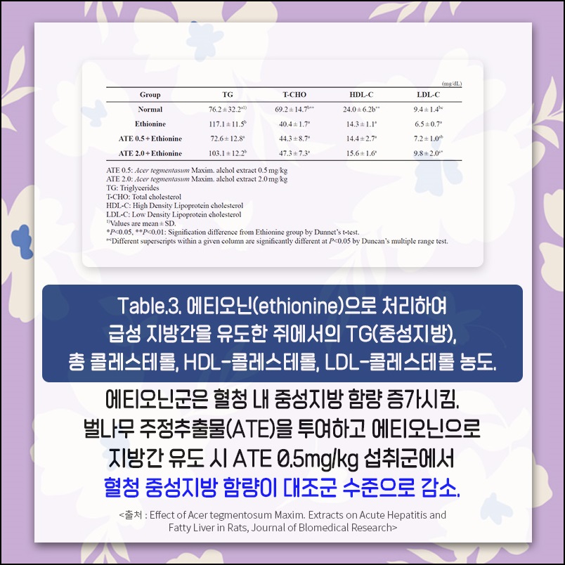 다양한 논문자료를 통해 지방간 완화, 중성지방 감소, 간 섬유화 억제 등 간과 혈관 건강에 좋은 여러 효능을 확인할 수 있습니다.