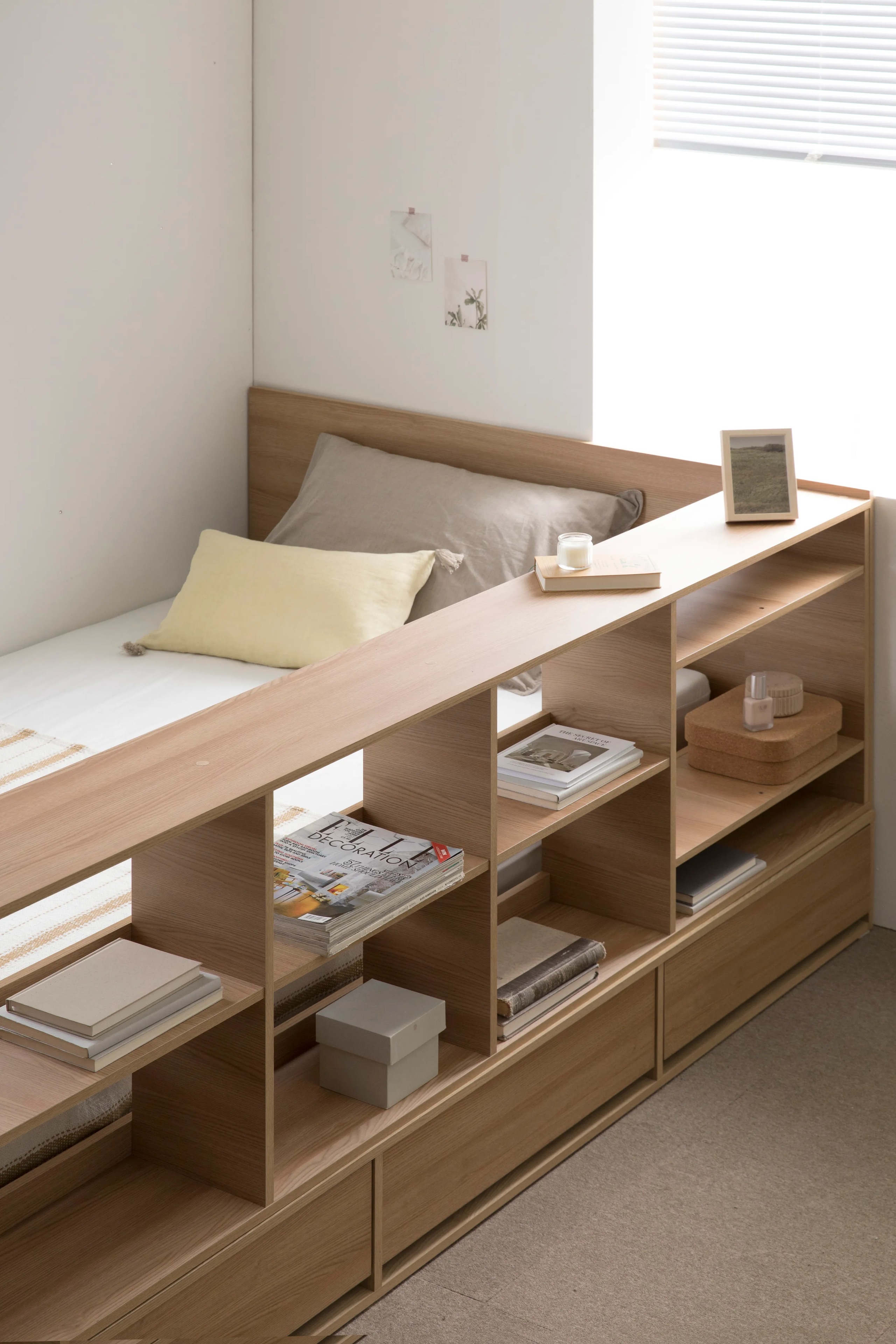 그리고 이렇게 침대 헤드보드 역할을 하기도 해요.단차를 둔 스킵 플로어 수납 침대 하나는 사용 편의성은 더하고 보다 아늑한 침실도 완성해 줍니다.