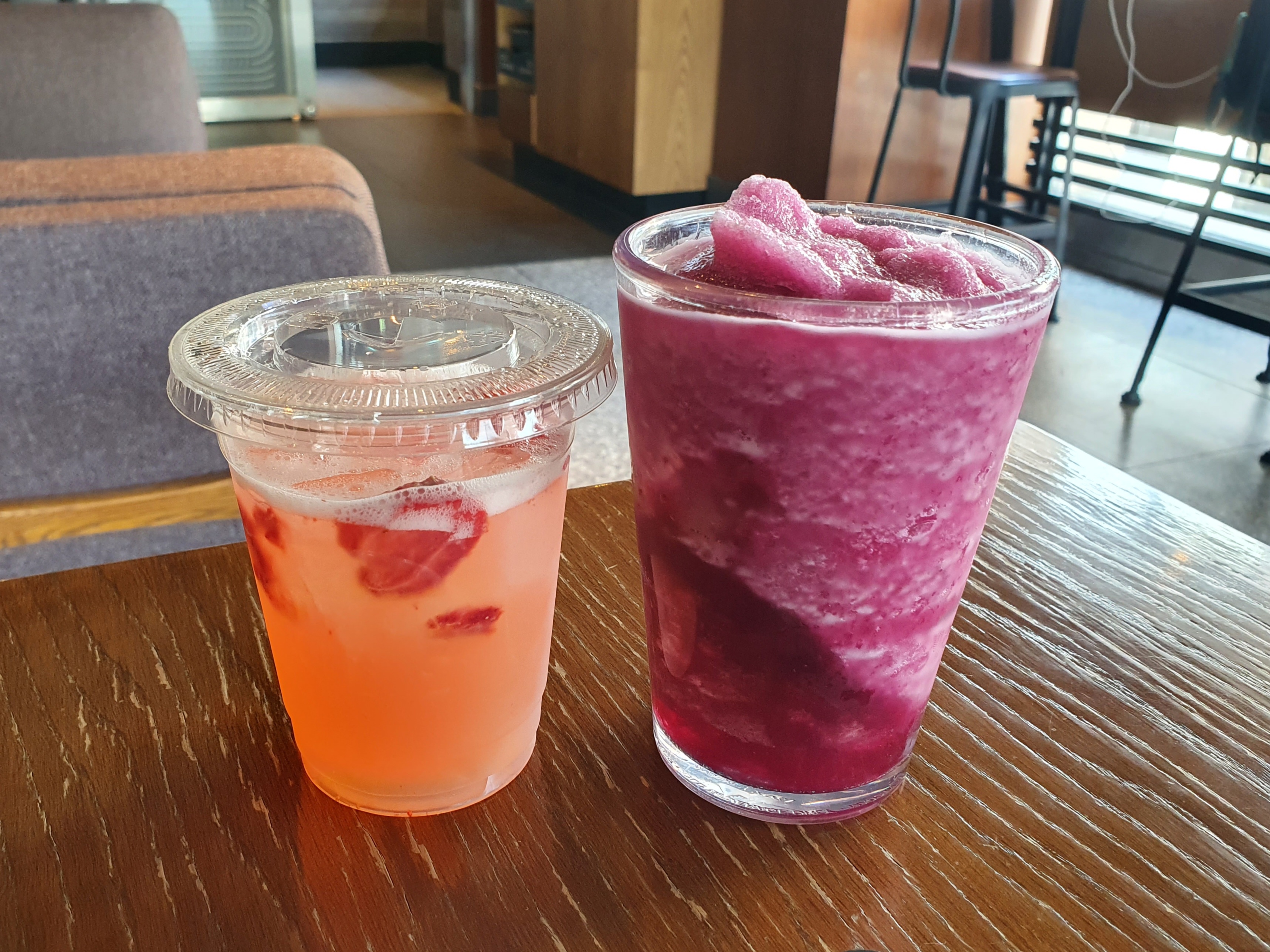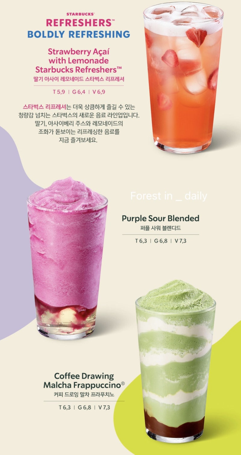 스타벅스 3가지 신메뉴 나왔습니다.퍼플 사워 블렌디드, 딸기 아사이 레모네이드 스타벅스 리프레셔, 커피 드로잉 녹차 플라푸치노 중 저는 딸기 아사이 레모네이드 리프레셔 사서 먹어봤어요~!