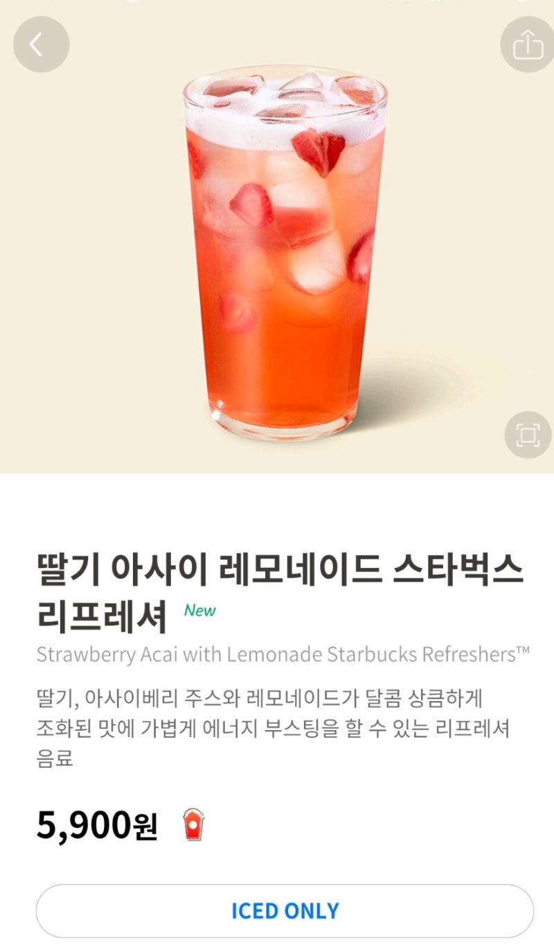 딸기 아사이레모네이드 스타벅스 리프레셔 5900, 6400, 6900원 딸기가 메인인 것 같습니다.색깔도 딸기 음료처럼 빨갛습니다.