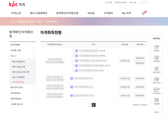 이 내역 중에 오른쪽에 보시면 자격신청 버튼과 취득내역서 버튼이 보이는데요.
