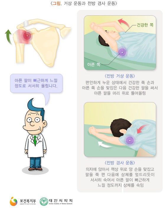 오십견 예방, 재활 오십견을 예방하기 위해서는 어깨 관절 주변부 근육 스트레칭이 매우 중요합니다!어깨관절의 적절한 가동범위를 경험시켜 늘리는 것이 어깨건강을 위해 좋기 때문입니다.(웃음)