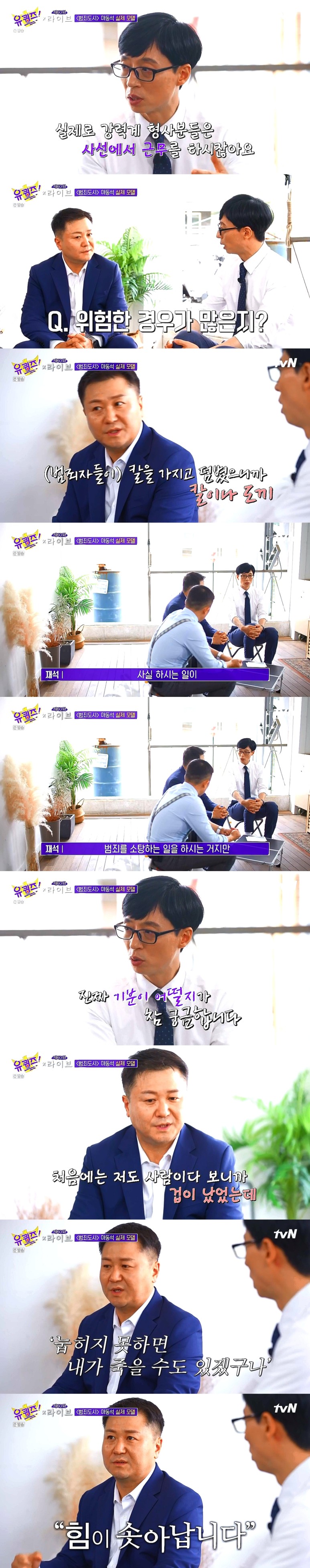 근데 윤석호 경위도 같은 사람이라 처음에는 무서웠는데 범죄자들을 안 재우면 내가 죽을지도 모른다는 생각을 하면서 그런 상황에서 힘이 난대요.