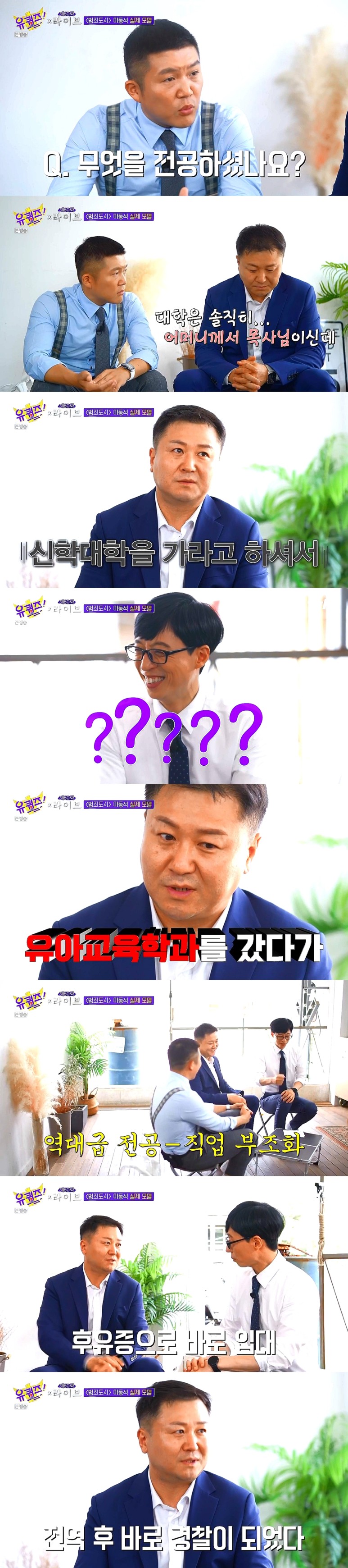 윤석호 경감 어머니가 목사님인데 신학대학으로 가라고 해서 유아교육학과에 갔는데 이건 도저히 제 적성이 아니라고 생각하고 바로 군대 갔다가 제대하고 바로 경찰이 됐대요.