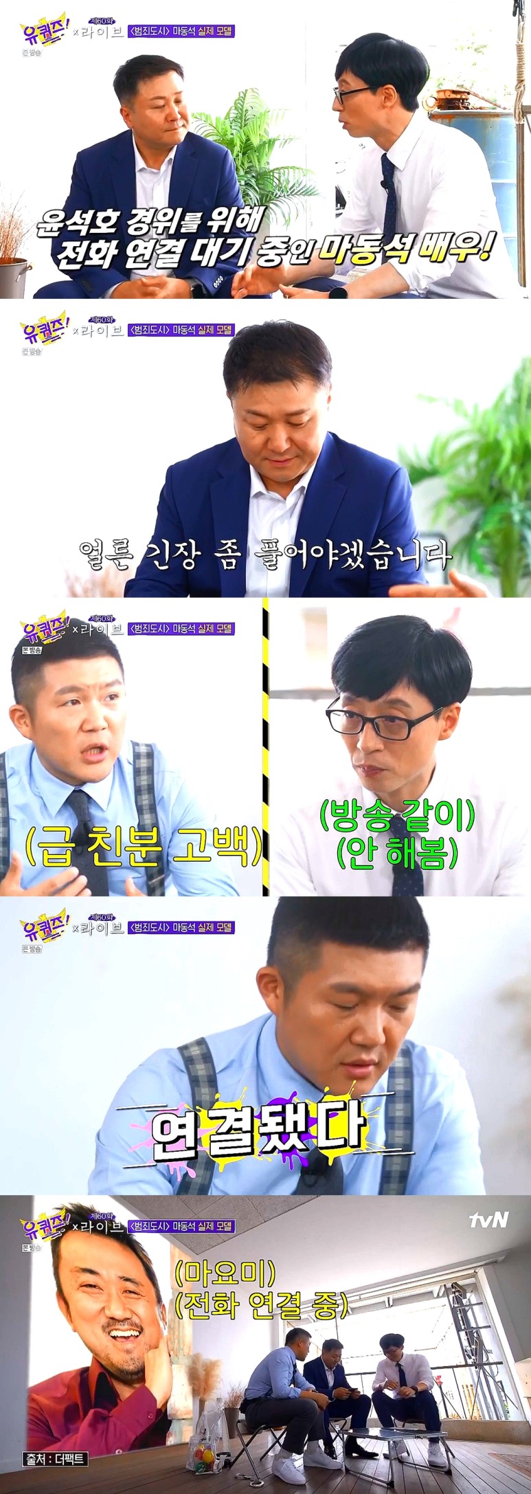 그래서 유재석이 긴장을 풀기 위해서 먼저 마동석과 통화를 했는데
