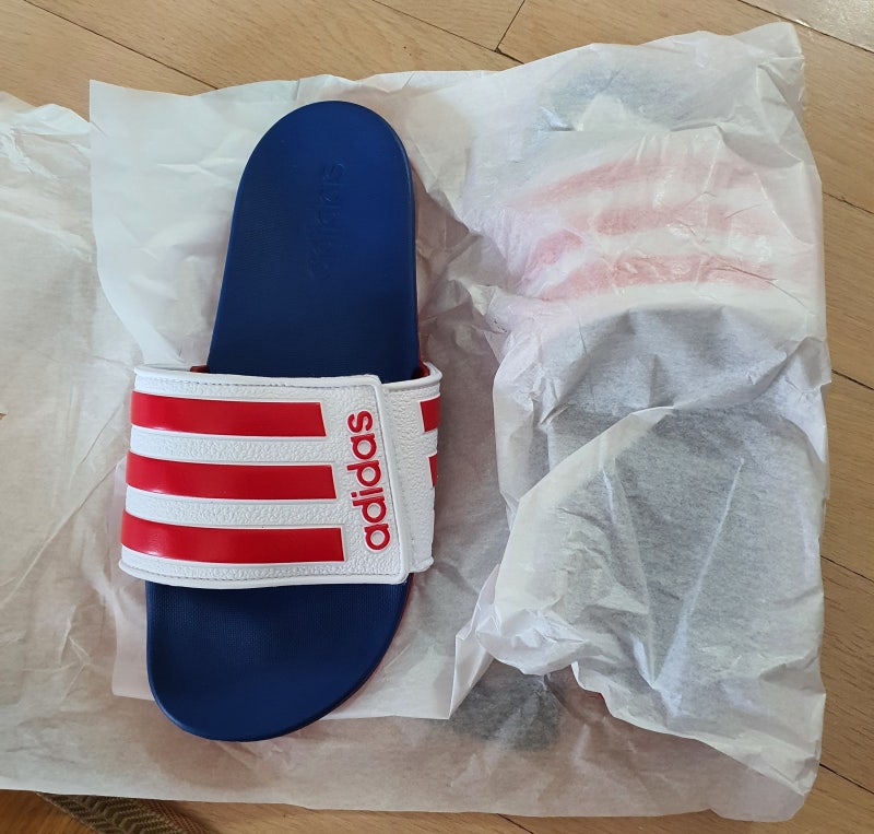 아디다스의 아딜렛 컴포트 시리즈 중 이 제품은 사실 키즈에 속해 있었습니다. 나는 흰색 바탕에 무지개 포인트를 좋아해서 알고 주문했어요. ㅎㅎ 8월1일 주문 8월3일 도착! 배송비포함 20840원에 겟!