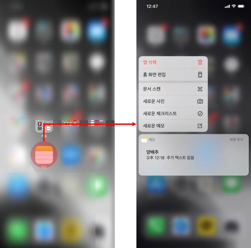 먼저 아이폰 홈 화면에서 메모 앱을 실행해 주세요. 메모앱은 기본앱이라 구매시 설치되어있습니다. 혹시 어디에 있는지 못 찾으시면 홈 화면 맨 오른쪽 페이지, 앱 사물함 상단에서 메모를 검색해주세요.