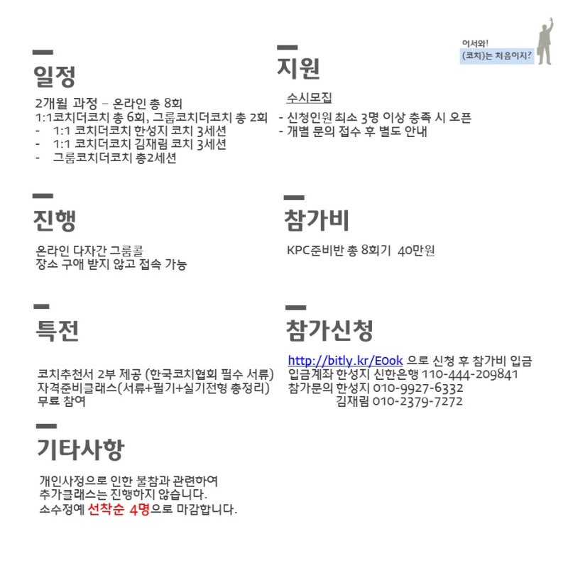 알렌드 KAC, KPC자격전문코치스쿨 모집(주말 5주 단기속성반!)