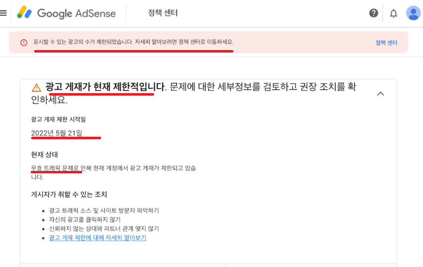 하지만 애드센스에 접속하면 아직도 이렇게 경고 메시지가 나타납니다.