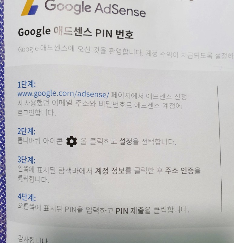 그럼 위의 메일에 적힌 방법으로 핀 번호를 입력해 보겠습니다.1단계 : 구글 애드센스 홈페이지 접속 → 계정 로그인