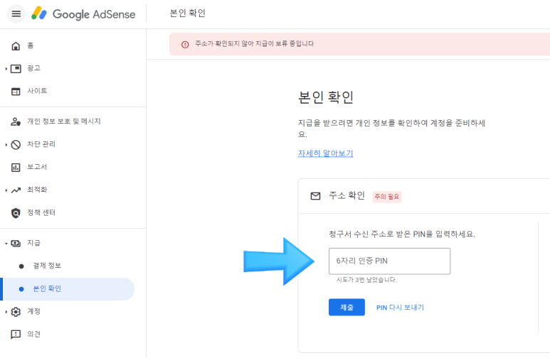짝짝짝! 다 끝났어요 주의해야 할 점 세 가지만 더 안내해드리고 정리드릴게요.주의1. 핀번호는 3번의 입력횟수 제한이 있으니 틀리지 않도록 꼼꼼하게 입력한다!주의 2. 핀번호 발행 후 발행일로부터 4개월 이내에 반드시 핀번호 입력!주의 3. 핀번호 발행 후 3~4주가 지나도 우편이 도착하지 않으면 핀번호를 재발행하여 반드시 4개월 이내에 입력한다!그렇지 않으면 광고가 중단될지도 모른다는 카드가 있어요.