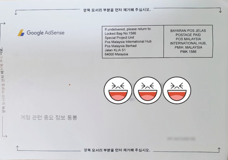 ▲ 구글어드센스 승인 우편물의 앞면과 뒷면 구글어드센스로 ᆼᄉᆼᅴ 이상의 광고수익이 발생하면 자동 발송되는 우편물입니다. 블로그를 작성한 사람이 개인정보를 작성할 때 쓴 그 주소에 본인이 정말 살고 있는지를 확인하기 위해서인 것 같습니다. 그런데 재미있는 것은 발송지가 미국이 아니라 말레이시아로 되어 있는 것이군요.