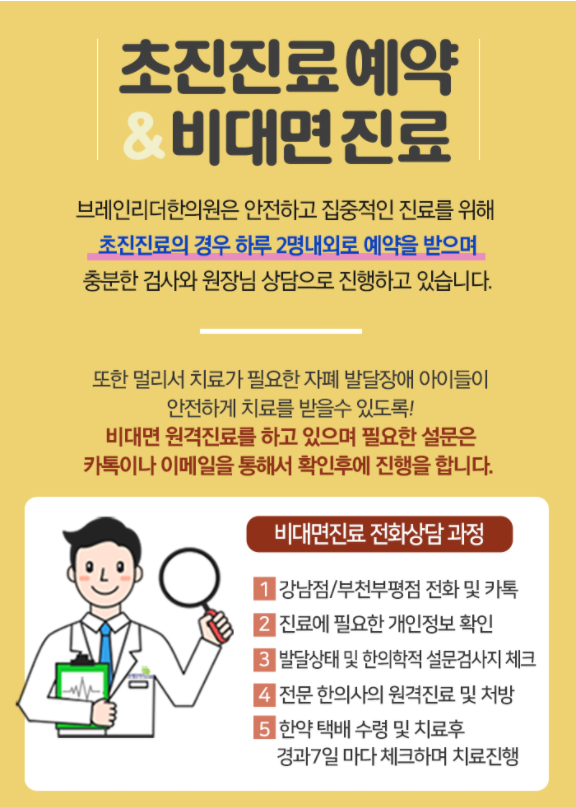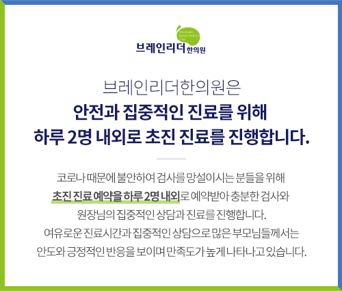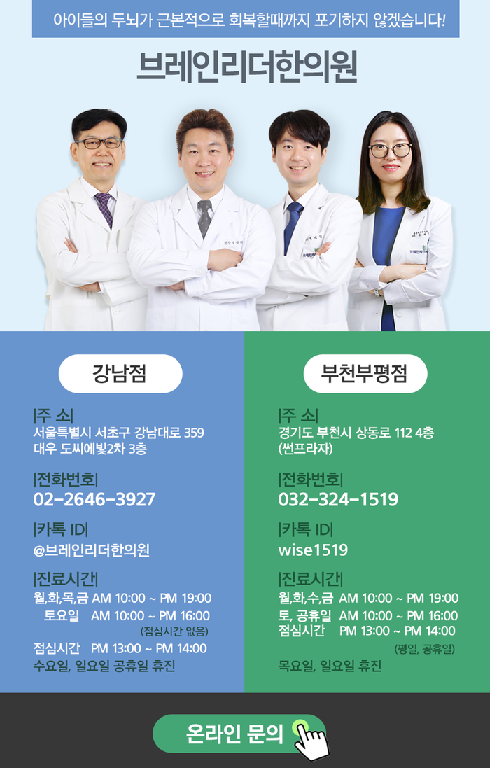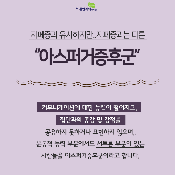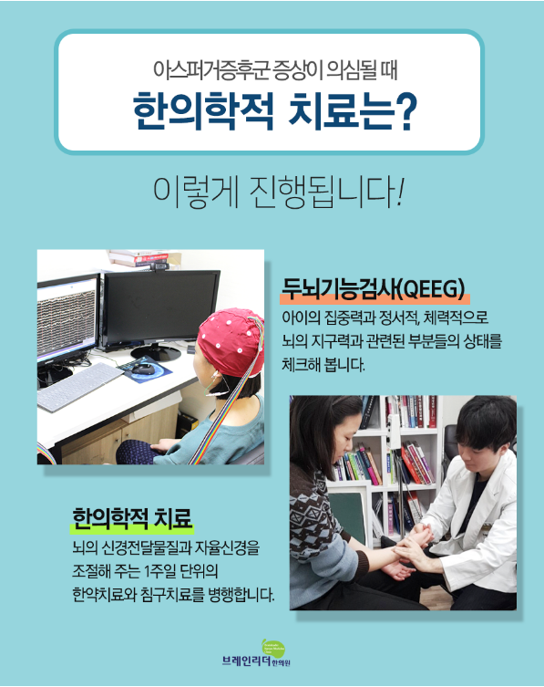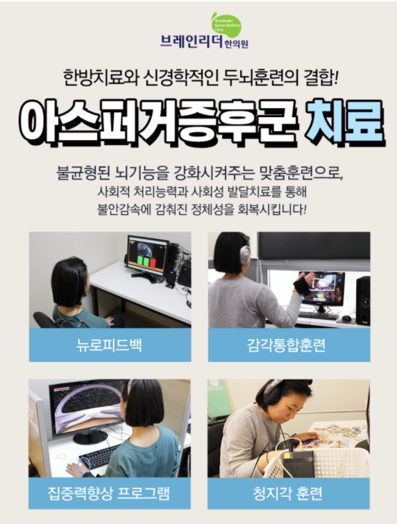저희 브레인 리더 한의원에서는 아스퍼거 증후군을 앓고 있는 아이들이 상황에 맞지 않게 말을 하거나 일방적으로 자신의 말만 나누려는 모습을 보이거나 때에 따라서는 다른 사람의 마음을 알 수 없어 남에게 상처를 주는 말을 아무렇지도 않게 하는 경우도 있으며, 다른 발달 장애에 비해 아스퍼거는 또래 집단과 접촉하는 시기가 되어서야 비로소 발견할 수 있으며, 아무래도 그것까지는 다소나마 깨어날 수 있는 아이들이라고 생각할 수 있습니다. 하지만 조금이라도 이상을 확인하면 지체 없이 검진을 받을 것을 권장하고 있습니다.