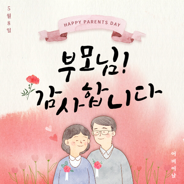 어버이날은 낳아 키워주신 어버이의 은혜에 감사함은 물론 어른, 노인을 공경하는 미덕을 기리는 날입니다. 영국과 그리스에서 사순절 첫날부터 넷째 일요일에 부모님의 영혼을 감사하려고 교회를 찾는 풍습과 미국 여성들이 어머니를 추모하기 위해 교회에서 흰색 카네이션을 나눠주면서 시작되었습니다. 한국에서는 5월 8일이 어버이날로 지정되었습니다.그 역사를 간단히 살펴보면 산업화, 도시화, 핵가족화로 인해 퇴색되어 가는 어른들의 양호와 경로사상을 확산시켜 국민정신계발의 계기로 삼아 우리 실정에 맞는 복지사회 건설에 기여하도록 하는 범국민적 기념일이라 할 수 있습니다. 1956년부터 5월 8일을 ‘어버이날’로 지정하고 경로효부모 행사를 해오는 과정에서 ‘어버이날’이 거론되어 1973년 제정·공포된 ‘각종 기념일 등에 관한 규정’에서 ‘[어버이날]’로 변경·지정하였습니다.1973년부터 매년 5월 8일은 어버이날이 된 것입니다. 어버이날 문구 이미지 모음 출처 : 무료 벡터 클립 아트 사이트