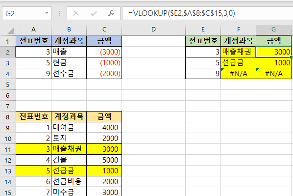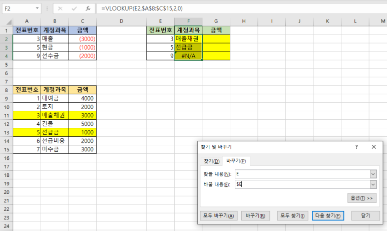 왼쪽에 보면 매출, 현금, 선수금은 대변 항목이기 때문에 마이너스로 했다고 가정합니다.