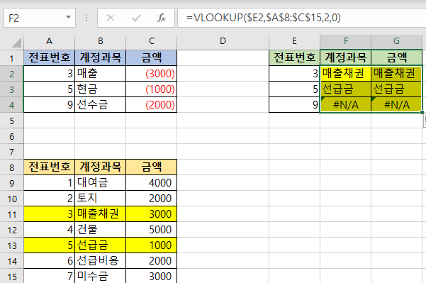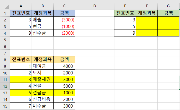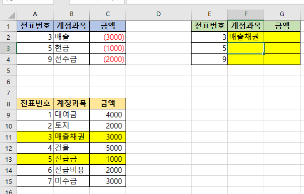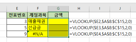 좌측 매출, 현금, 선수금 전표번호에 따른 상대계정치를