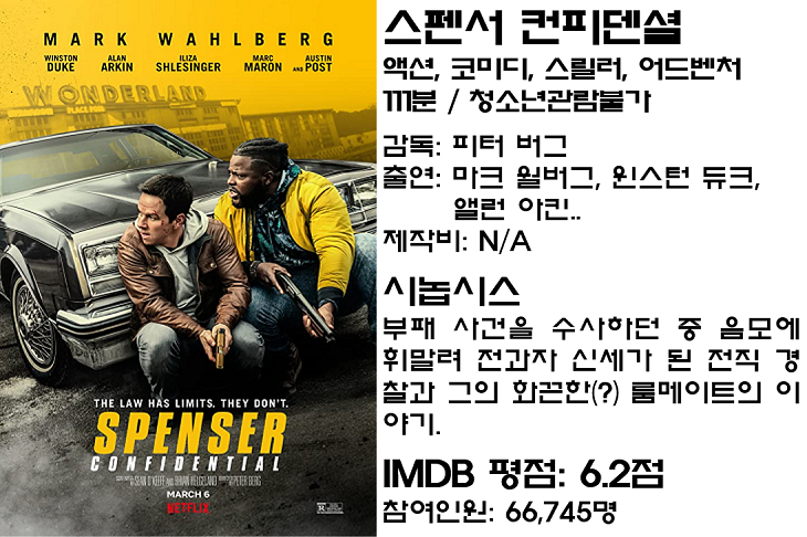 미국 작가 에이스 앳킨스가 2013년에 발표한 소설 ‘Wonderland’를 바탕으로 제작된 <스펜서 컨피덴셜>은 버디 무비의 정형화된 제작 공식을 그대로 답습하고 있기는 하지만 마크 월버그에 대한 거부감만 없다면 킬링타임용으로 무난하게 즐길 수 있는 영화입니다.