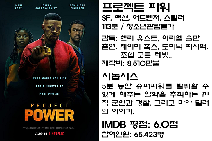 8월 14일 개봉한 넷플릭스 오리지널 SF 액션 스릴러 영화 ‘프로젝트 파워’는 제이미 폭스와 조지프 고든&레빗의 출연 및 슈퍼파워 알약 등의 설정으로 개봉 전부터 큰 기대를 받았으나 서사적인 부분에서 허점을 드러내 적잖은 사람들에게 실망감을 안겨준 작품입니다.