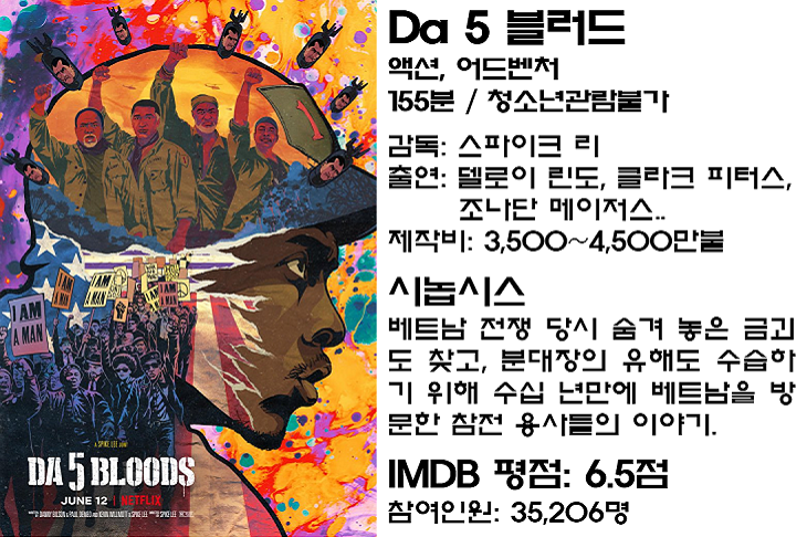 6월 12일 개봉한 넷플릭스 오리지널 액션 어드벤처 영화 <Da5 브래드>는 커리어를 통해 흑인의 인권과 관련된 영화를 연출해온 스파이크 리 감독의 작품답게 흑인의 시각에서 본 베트남전에 대한 이야기를 다룬 작품입니다