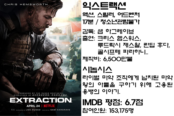 그럼, 2020년에 개봉한 넷플릭스 오리지널 액션 영화 중 가장 높은 IMDB 평점을 기록하고 있는 작품은 어떤 영화일지 지금부터 함께 보시겠습니다.