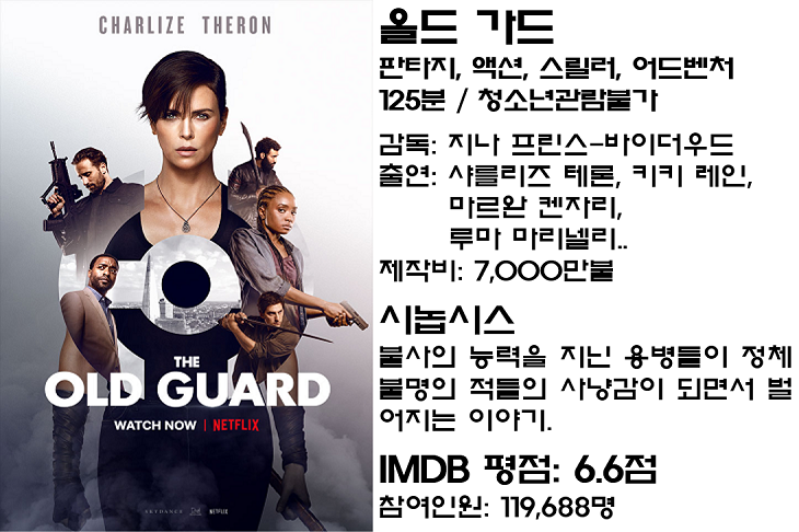 원작자 그렉 루카가 스스로 각색한 <올드가드>는 (일각에서) 흥미로운 설정을 제대로 살리지 못했다는 평가를 받고 있음에도 <매드맥스: 분노의 도로>(2015)에서는 자신이 연기한 <퓨리오사> 못지않은 압도적인 존재감을 보여준 샤를리즈 새론의 활약으로 역대 넷플릭스 오리지널 시청 랭킹 6위에 랭크되었습니다.