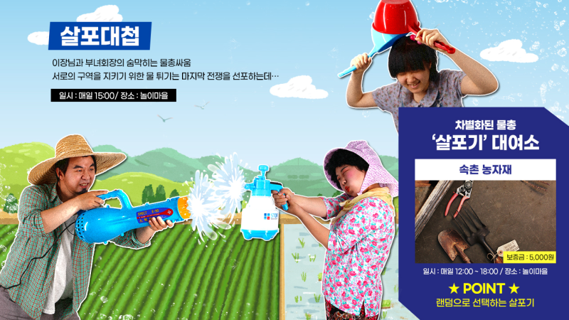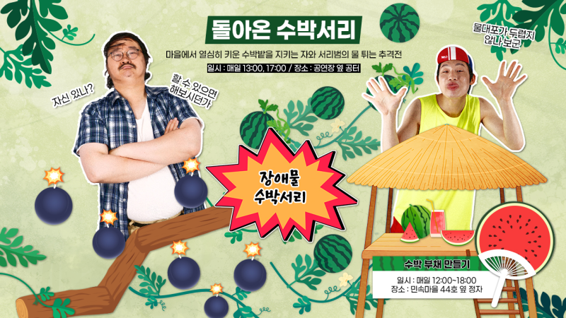 출처 : 한국민속촌 한국민속촌 ‘그해 시골의 여름’ 행사내용 2022 한국민속촌 리얼 – 마을강수!’그 해 시골 여름’ 축제의 하이라이트는 민속촌에서 펼쳐지는 수박밭 주인과의 짜릿한 한판 승부! 매년 여름이면 나타나는 수박 상범들에게 마냥 당할 수 없는 수박밭 주인이 큰 장애물을 준비했다. 한층 업그레이드된 수박 서리는 실패 시 엄청난 벌칙이, 성공 시 달콤한 여름 음료를 선물받는다.이 밖에도 살포기를 들고 상대방에 맞서 싸우는 이색 물총싸움 살포대첩을 통해 올여름 더위를 시원하게 날려보자!