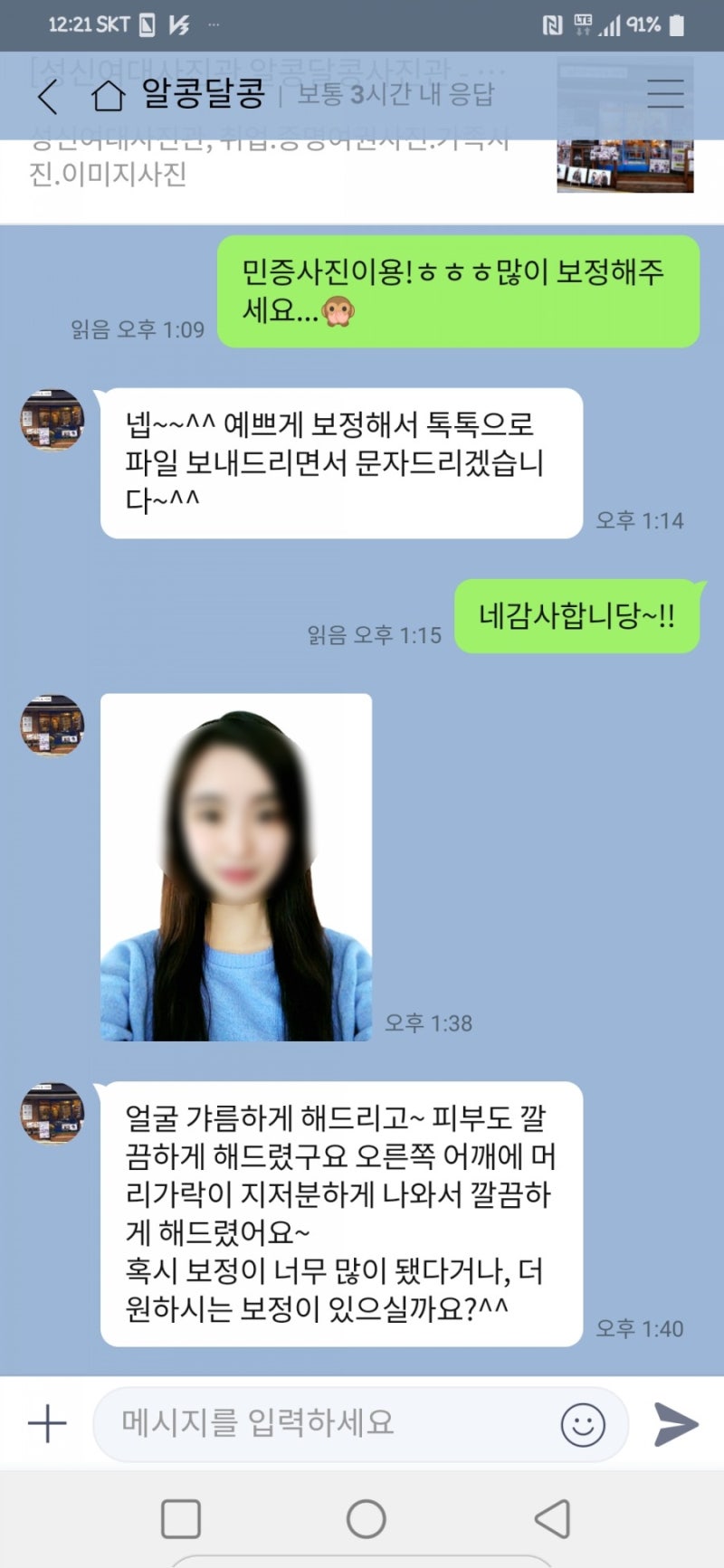 Send photos via email and request correction via Naver Talk! When you go directly to the photo studio, it’s a little difficult to request correction as you want, but it’s easy to request and it’s very kind.