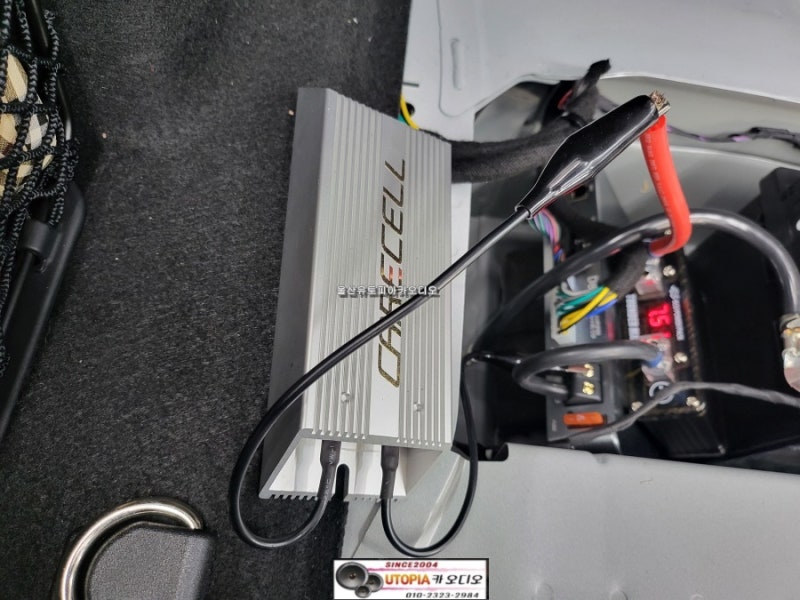 배터리 정전압 장치 장착 시 저항 충전기를 사용하여 스파크가 생기는 것을 방지합니다.울산 유토피아 카 오디오는 안전하게 작업합니다.차 주인의 차는 소중하니까요.^^ 정품 앰프 포지션부에 장착 마감합니다.