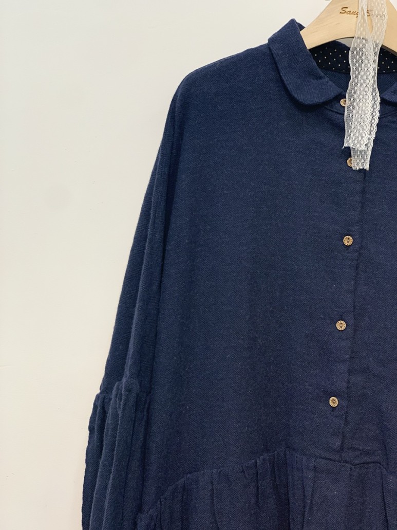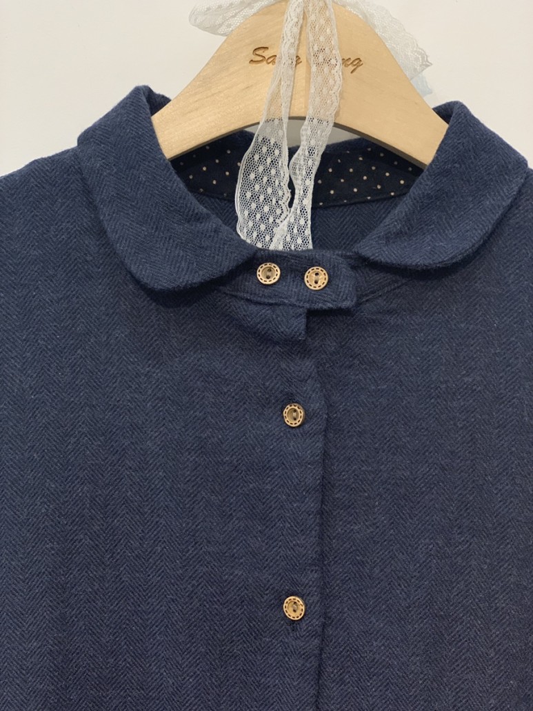 좁은 라운드넥에 둥근 카라 디자인으로 여성스러운 무드를 주며 카라 아랫단추를 투버튼으로 디자인하여 단정하고 귀여운 포인트를 줍니다