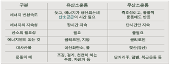 유산소 운동은 산소가 필요한 운동으로 대표적으로 달리기, 계단 오르기, 수영, 자전거 타기 등 저강도 운동으로 장시간 지속 가능한 운동입니다. 체내에 저장된 에너지가 사용되는 속도가 느리고 충분한 산소 공급을 통해 에너지를 생산할 수 있습니다. 유산소 운동은 체내 지방이 에너지원으로 사용되지만 운동 시작 후 20~30분이 지났을 때부터 사용되기 때문에 30분 이상 지속해야 합니다. ※ 비만이 있으면 무릎 관절에 과부하가 걸릴 수 있으므로 주의해야 하며 과도한 운동 시 혈당량이 감소하여 수분이 손실됩니다. 무산소 운동