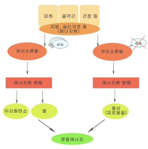 유산소 운동은 산소가 필요한 운동으로 대표적으로 달리기, 계단 오르기, 수영, 자전거 타기 등 저강도 운동으로 장시간 지속 가능한 운동입니다. 체내에 저장된 에너지가 사용되는 속도가 느리고 충분한 산소 공급을 통해 에너지를 생산할 수 있습니다. 유산소 운동은 체내 지방이 에너지원으로 사용되지만 운동 시작 후 20~30분이 지났을 때부터 사용되기 때문에 30분 이상 지속해야 합니다. ※ 비만이 있으면 무릎 관절에 과부하가 걸릴 수 있으므로 주의해야 하며 과도한 운동 시 혈당량이 감소하여 수분이 손실됩니다. 무산소 운동
