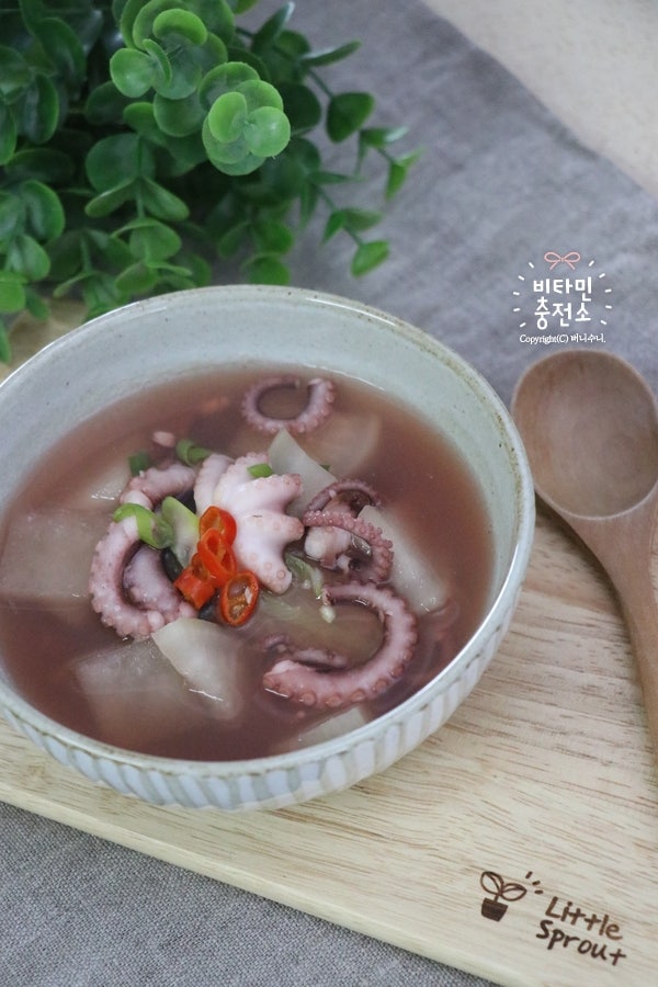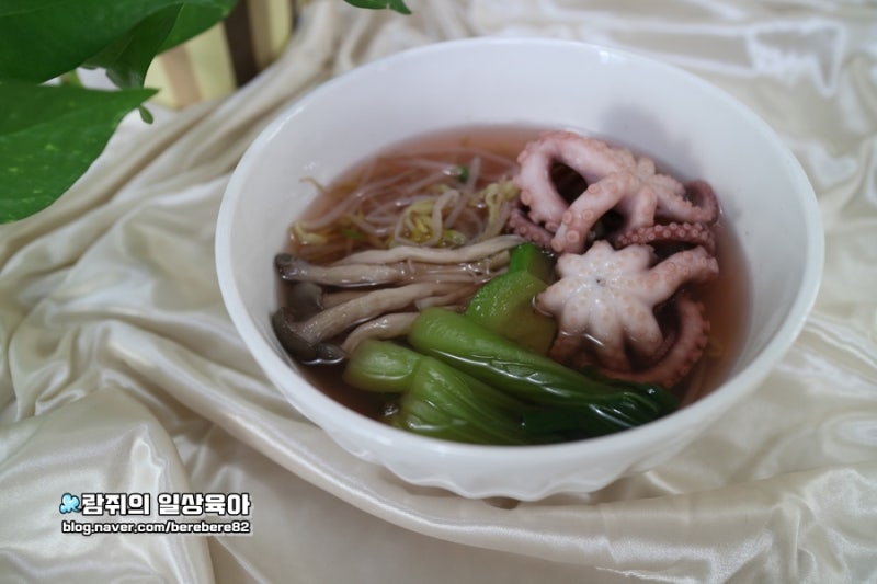 문어를 너무 오래 끓이면 딱딱해지기 때문에 완성될 때쯤 마지막으로 손질한 문어를 넣어주세요.한 2분 정도 끓인 후 파를 넣고 마무리합니다.먹기 좋게 문어를 자른 후 아이국그릇에 나눠줬어요.한파 속에서 계속되는 추위에 영양만점 아기 용포탕으로 우리 아이의 건강을 지켜봐 주시기 바랍니다.언뜻 보기에 오징어뭇국과 비슷한 레시피로 문어뭇국이라고 해도 말이 되는 아기용포탕 레시피였습니다.