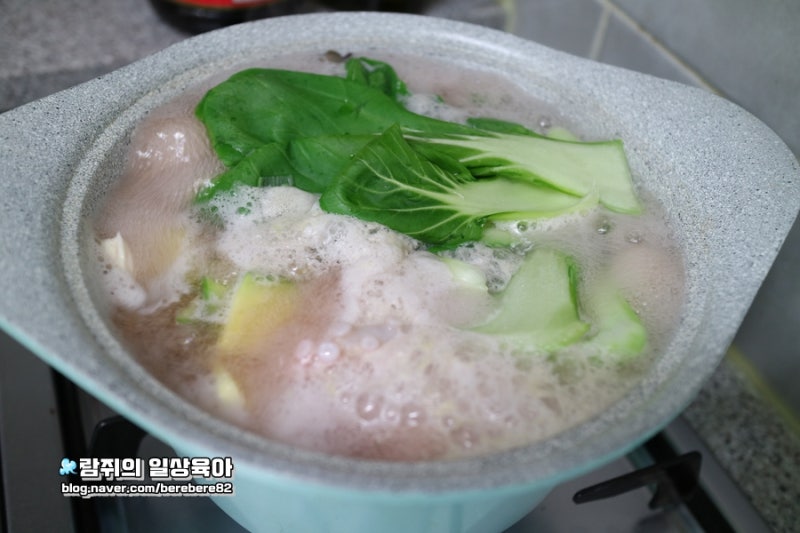 중불에 끓여서 얇은 간장으로 간을 하고 마늘을 반큰술 넣어 주었습니다.