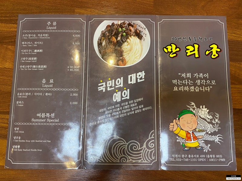 인천광역시 중구 용유서로 499 OPEN 10:00 / CLOSE 21:00 (매주 화요정휴) 주차가능 PRICE 야끼우동 \10,000칸쇼새우(중)\20,000짜장면\7,000