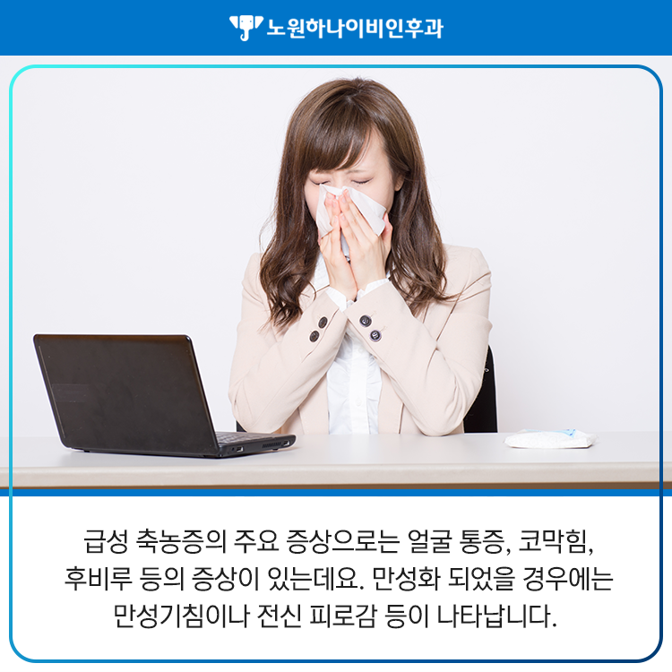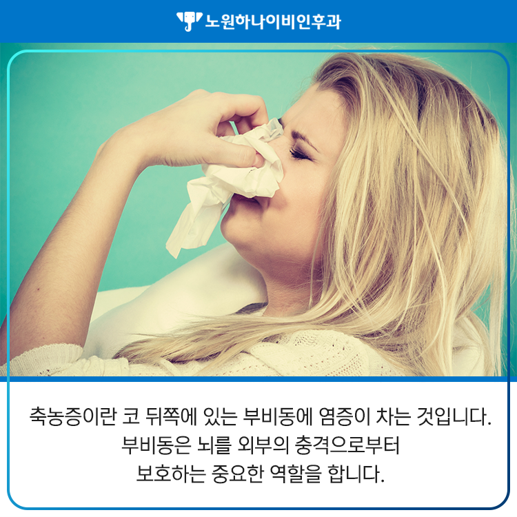 축농증이란 코 뒤에 있는 부비강이라는 공간에 염증이 생기는 것을 말합니다. 부비강은 뇌를 외부 충격으로부터 보호하는 중요한 역할을 합니다. 또한 외부에서 유입된 공기가 부비강을 지나면서 머리의 열을 식혀 줍니다. 부비동을 연결하고 있는 작은 통로인 자연공을 통해 부비동 환기가 이루어집니다. 만약 세균이나 바이러스 감염으로 자연 구멍이 좁아지면 부비강 내 환기가 제대로 되지 않아 분비물이 쌓이는데, 쌓인 농성 분비물은 여러 합병증을 유발합니다.