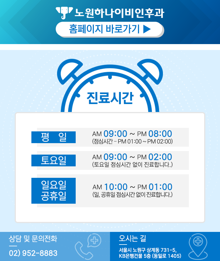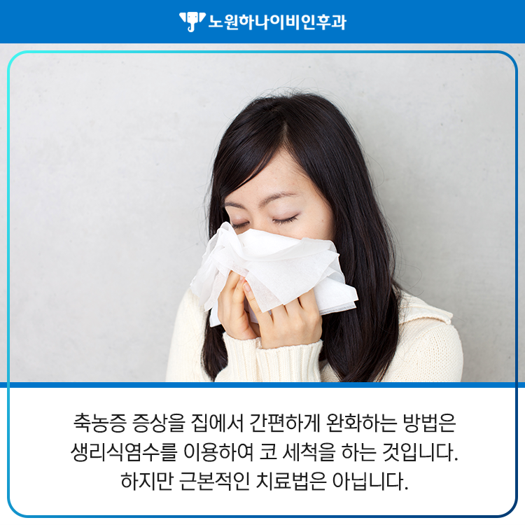 축농증의 증상을 집에서 쉽게 완화하는 방법은 생리식염수를 이용해서 코세척을 하는 것입니다. 코로 식염수를 넣은 후 입으로 뱉어내시면 되는데 근본적인 축농증 치료 방법이 아니므로 축농증의 확실한 치료를 원하시면 노원하나이비인후과를 찾으시기 바랍니다. 7호선 노원역 6번 출구 바로 앞 KB국민은행 빌딩 5층에 위치한 노원 하나이비인후과는 일요일 및 공휴일에도 진료를 실시합니다. 상담 및 문의사항은 02)952-8883으로 답변해 드립니다. 노원하나이비인후과 홈페이지를 방문하시면 보다 자세한 내용을 확인하실 수 있습니다. 하단의 배너를 클릭하면 노원하나이비인후과 홈페이지로 이동합니다.