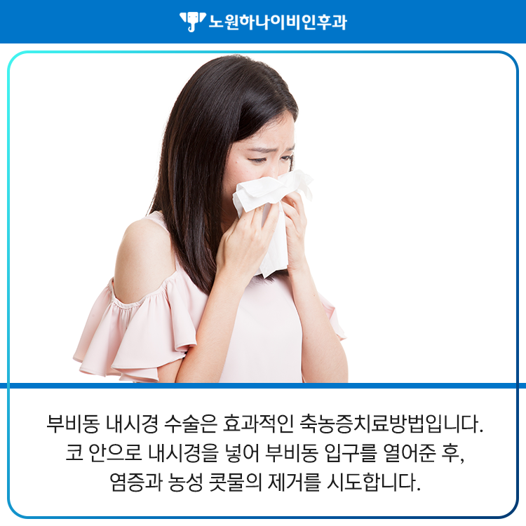 부비강 내시경 수술은 효과적인 축농증 치료 방법입니다. 콧속에 내시경을 넣어 부비강 입구를 연 후 염증과 농성 콧물 제거를 시도합니다. 이로 인해 부비강 내 환기가 쉬워지므로 증상 호전에 효과적입니다. 노원하나이비인후과에서는 축농증 치료를 위한 FHD 고화질 내시경, 최신 미세 절삭기 등 최고 수준의 장비를 보유하고 있습니다. 또한 내비게이션이나 풍선 확장술 등의 최신 치료도 적용하고 있습니다.