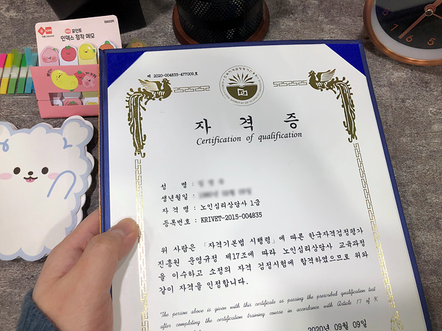 노인심리상담사 자격증은 이렇게 누구나 쉽게 취득할 수 있다는 장점이 있었습니다 제가 그동안 하고 싶었던 공부도 하면서 유익한 내용도 많이 접하게 되어 더욱 좋았습니다.