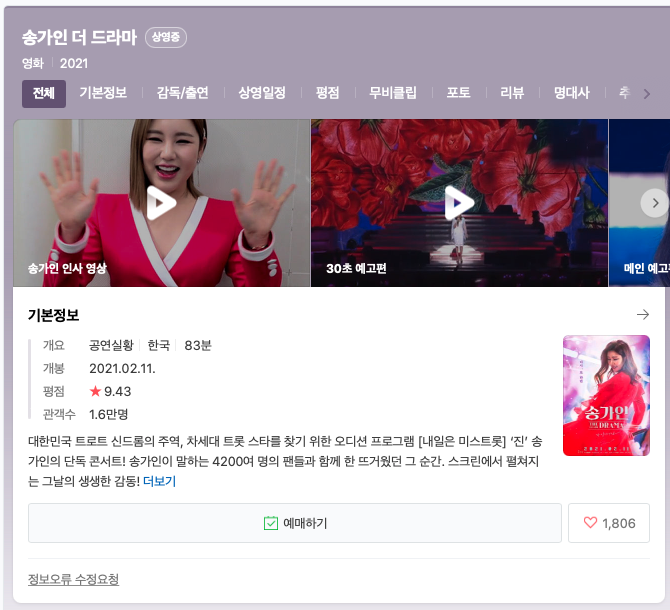 참고로 코로나19로 인해 영화계 자체가 다운되고 있지만 2021.02.11 개봉 후 현재까지 거의 2만명 이상의 관객을 매료시켰다고 합니다.송가인과 김연아?