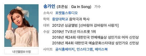 가끔 송가인을 검색하면 김연아가 연관검색어로 떠오르는 경우가 있습니다. 이건 예전에 갤럭시노트20 행사에 송가인이 참석한 적이 있는데 여기서는 국민 여동생인 김연아도 참석했었습니다. 김연아를 처음 본 송가인의 표정과 행동, 그리고 반응이 너무 재미있어서 사람들의 이목을 끌게 되었습니다.가집 01. 찍어 02. Tears 03. 가인이여 04. 거기까지 05. 망가진 벽시계 06. 단장 미아리 고개 07. 모르는 것 같아 08. 목포의 눈물 09. 무명배우 10. 듣고 싶어 11. 사랑가 12. 사랑에 빠져봅시다 13. 사랑의 밧줄 14. 산바람아 강바람아 15. 서울의 달 16. 성산 일출봉 17. 애수의 소야곡 18. 엄마 사랑해요 19. 엄마 아리랑 20. 영동불스 21. 용두산 엘리지 22. 이별의 영동선 23. 장녹수 24. 정말 좋았던 25. 진정입니까 26. 28. 다음에도 재밌는 이야기로 찾아오도록 하겠습니다!이상! 말이 많은 아저씨였습니다!