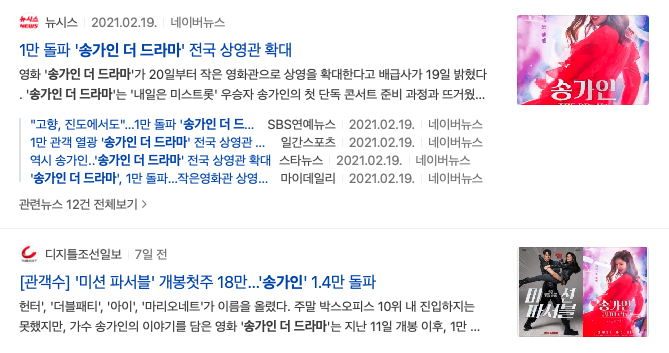 최근 설에 송가인 더 드라마라는 송가인의 콘서트 ‘가인이여’ 실황과 여러 인터뷰 영상과 비공개 영상을 담은 영화가 공개됐습니다. 아무리 가수가 인기가 많아도 영화로 제작되는 경우는 상당히 드문 것을 감안하면 그 인기가 정말 대단하다는 것을 알 수 있습니다.