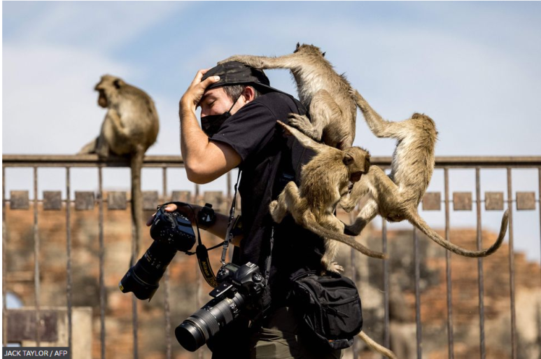 태국의 한 사원에서 마코원숭이들이 사진사에 올라탄 모습