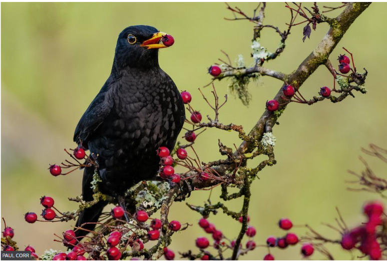 맛있는 베리 열매를 먹고 있는 블랙버드