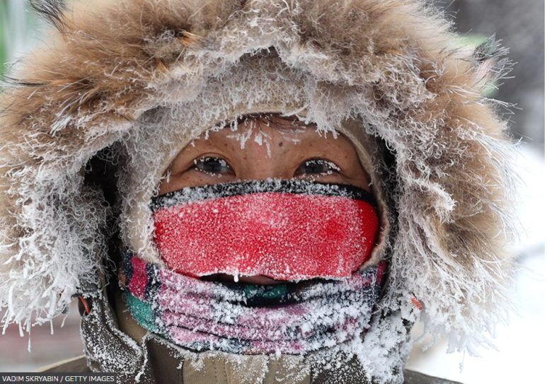 러시아 동시베리아의 사카 공화국 수도 야쿠츠크에서 영하 35도의 추위에 얼굴을 가리고 있는 남자의 모습