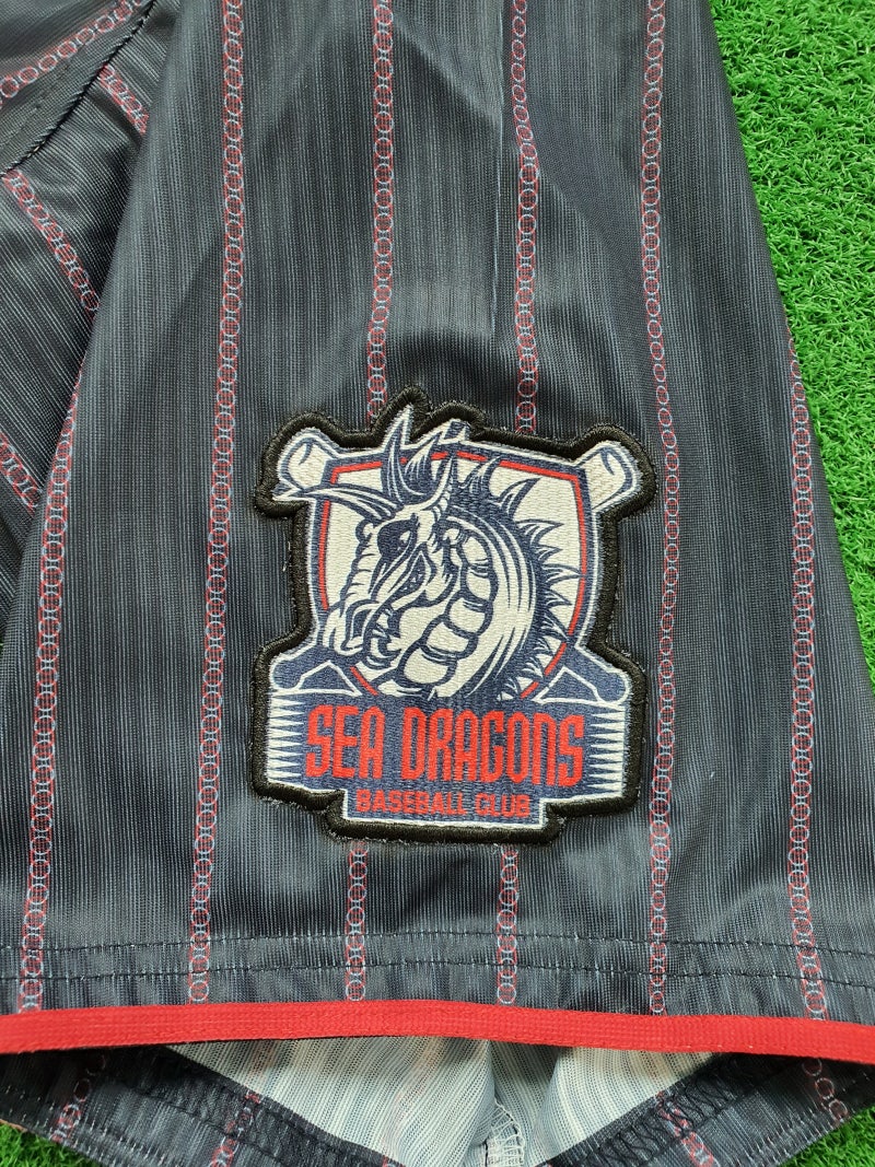 씨드래곤즈 야구 유니폼 좌우 소매에는 인천항만공사 엠블럼과 팀 로고 엠블럼을 각각 달고 있습니다. 유니폼 마크도 요즘은 디지털 프린팅으로 인쇄 후 오버록 작업으로 붙이는 방식을 많이 사용합니다.고객님께서 자수를 원하시면 자수도 가능합니다.디지털 프린팅 마크는 보다 세밀하고 다양한 표현을 할 때 효과적입니다.