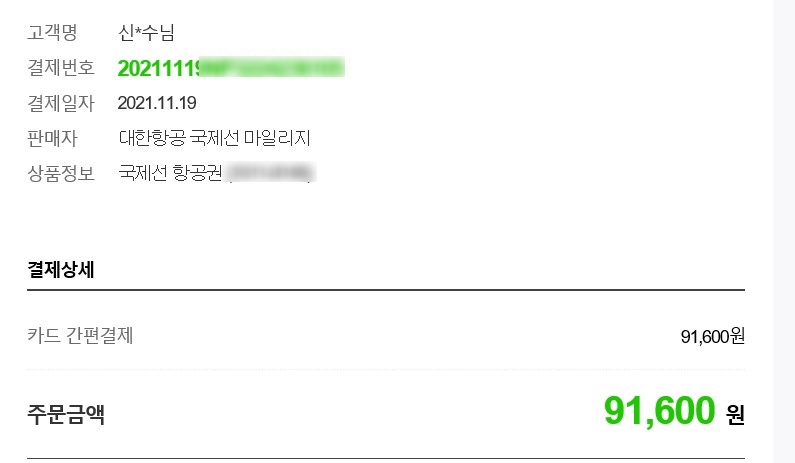 저는 아시아나 마일리지 공제로 예약을 했고 사모님은 아시아나 편도 결제를 한 상태입니다.