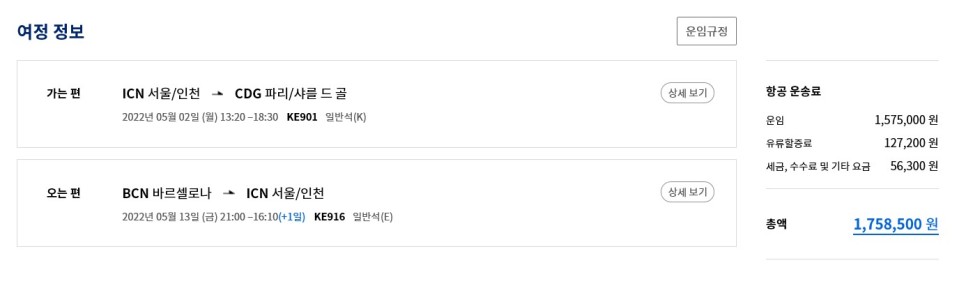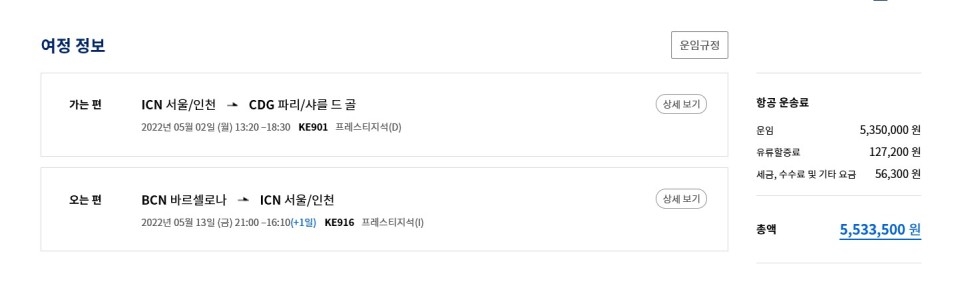고시국 대한항공 마일리지로 예약한(편도) 파리 예약 공유합니다.