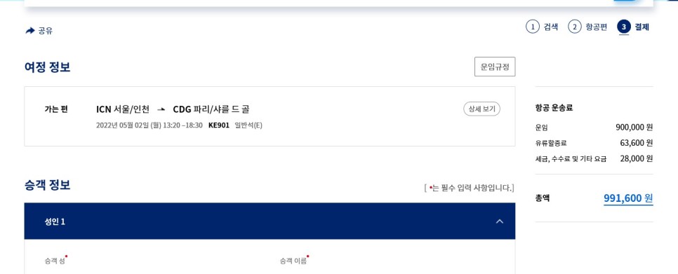 총 91,600원으로 인천공항-파리 편도예약을 완료하였습니다.