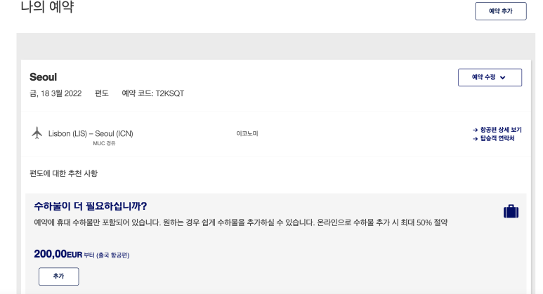그러면 리스본 – 인천 티켓만 남았고 인천 – 바르셀로나 티켓이 없었어요. 그리고 수하물 추가란까지 나왔어요. 어이없어요. 왜냐하면 위탁수하물 23kg이 있는 걸 확인하고 예약했거든요. 진심으로 여러가지 어이가 없었어요.
